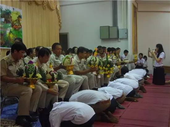 (泰国教师节,学生给老师们别上胸花,每班学生代表给教师们送上自制花盘,行跪拜礼)