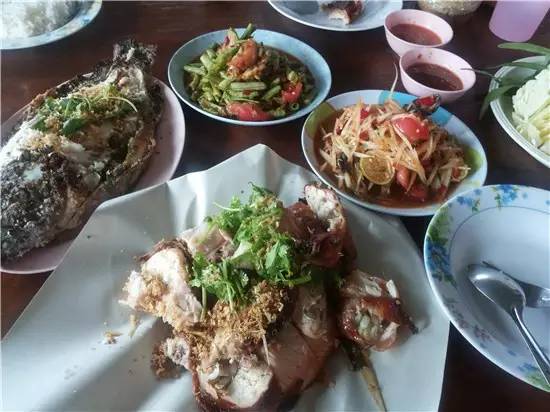 (泰国东北部较常见的“大餐”,三宝“烤鸡,糯米饭,凉拌木瓜丝”)