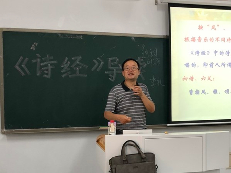 随后,施常州结合《诗经》的创作背景,介绍了其编撰过程。在周王朝,《诗经》除了用于典礼、娱乐、讽谏、教育贵族子弟,还用于外交场合“赋诗言志”等。紧接着,施常州具体解释了相关名词的含义,拓宽了同学们的知识面,并鼓励同学们积极保护和弘扬传统文化。