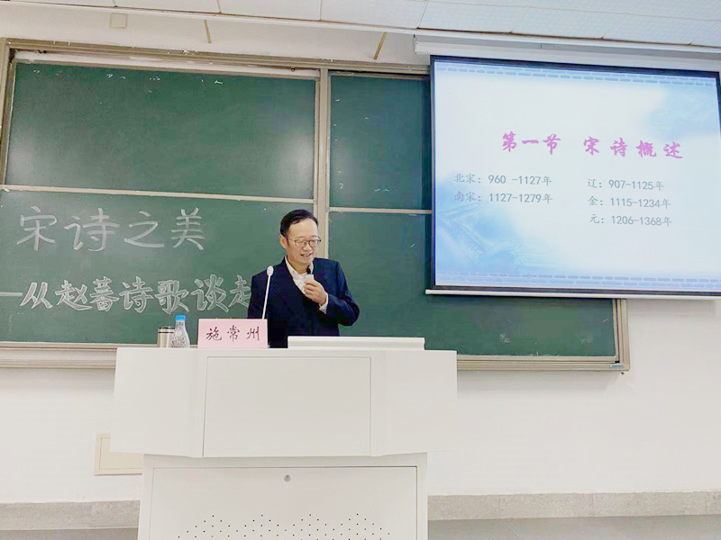 最后,施常州引出唐诗与宋诗的优劣之论,引导同学们积极思考,并引用前人观点,将唐诗比作重象主情的诗人之诗,将宋诗比作重意主理的学者之诗。