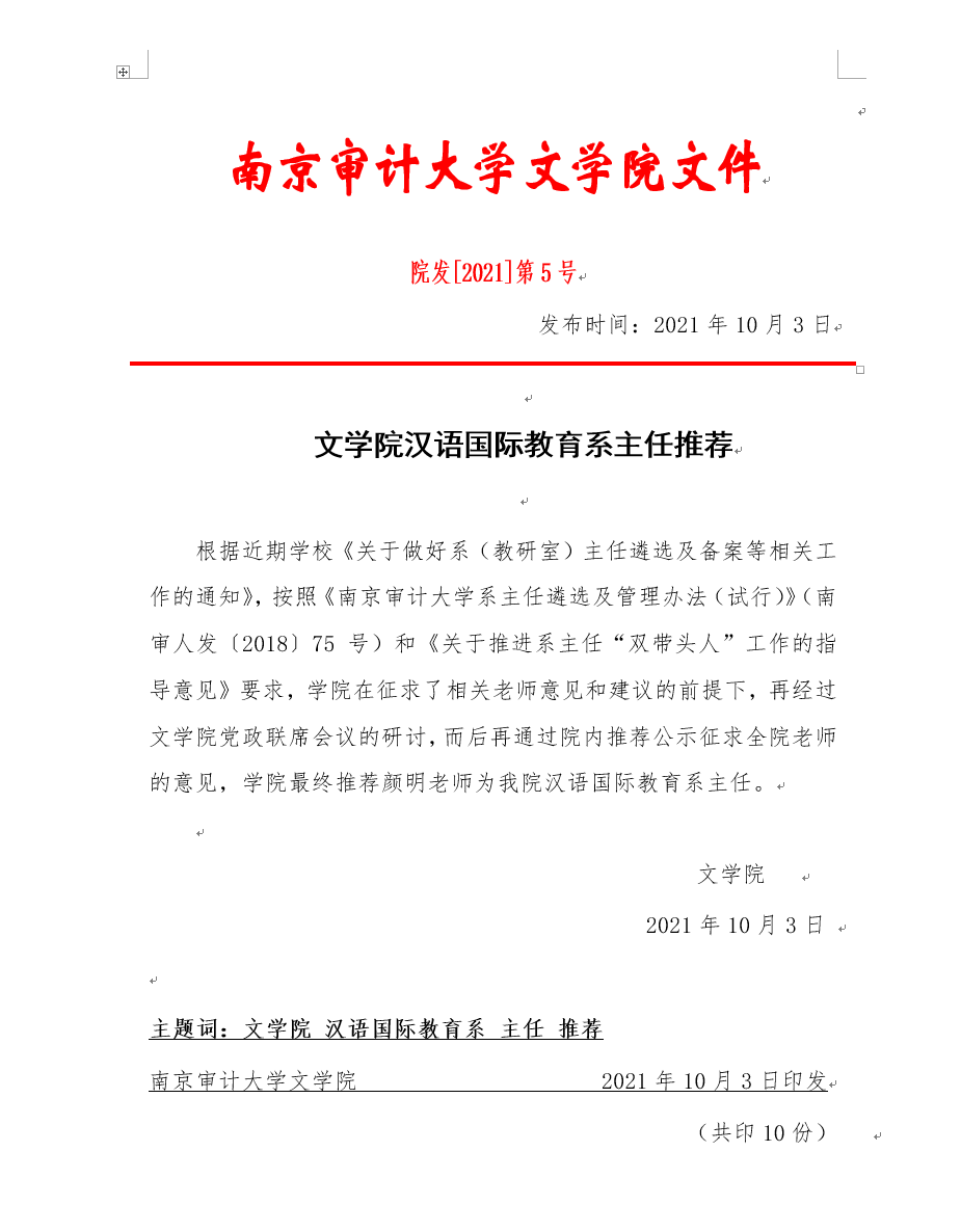 根据近期学校《关于做好系(教研室)主任遴选及备案等相关工作的通知》,按照《williamhill中国系主任遴选及管理办法(试行)》(南审人发〔2018〕75 号)和《关于推进系主任“双带头人”工作的指导意见》要求,学院在征求了相关老师意见和建议的前提下,再经过WilliamHill中文党政联席会议的研讨,而后再通过院内推荐公示征求全院老师的意见,学院最终推荐颜明老师为我院汉语国际教育系主任。