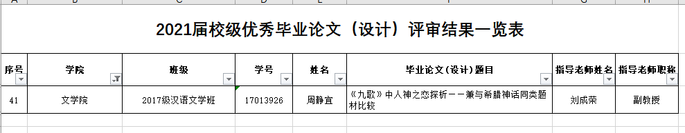 二、2021.9.29刘成荣老师指导、2017级学生周静宜的毕业论文“《九歌》中人神之恋探析——兼与希腊神话同类题材比较”获得2021届校级优秀毕业论文
