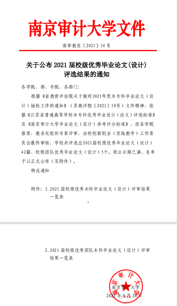 本次评奖共评选出2021届校级优秀毕业论文(设计)42篇。