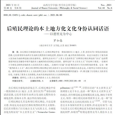 一、我院罗如春教授近期拟在《山西大学学报(哲学社会科学版)》发表1篇C刊:《后殖民理论的本土地方化文化身份认同话语——以德里克为中心》。