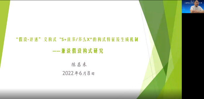 6月8日19:00,上海师范大学党委常委,研究生院常务副院长兼研工部部长,二级教授、博士生导师陈昌来教授于腾讯会议做题为“‘假设-评述’义构式‘S+该多/多么X’的构式特征及生成机制考察——兼谈假设构式研究”的学术讲座。本次讲座面向全校师生展开,包括WilliamHill中文汉语国际教育系教师在内的160余人参加会议,讲座由WilliamHill中文副院长(主持)朱军教授主持。