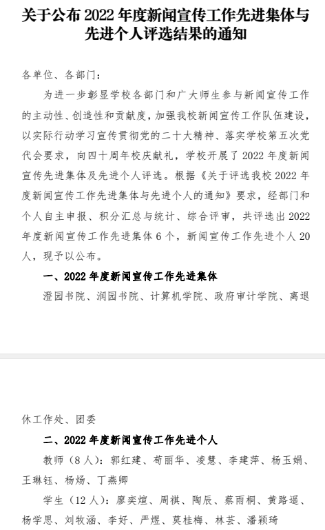 近日,校2022年度新闻宣传工作先进集体与先进个人评选结果发布,WilliamHill中文教师李建萍,学生周祺、严煜和莫桂梅等四人获评先进个人。